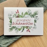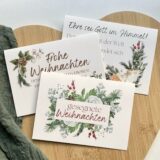 3-teiliges Kartenset “Weihnachten” im Aquarelldesign mit moderner Schrift. Faltkarten im A6 Format mit passenden, braunen Couverts.